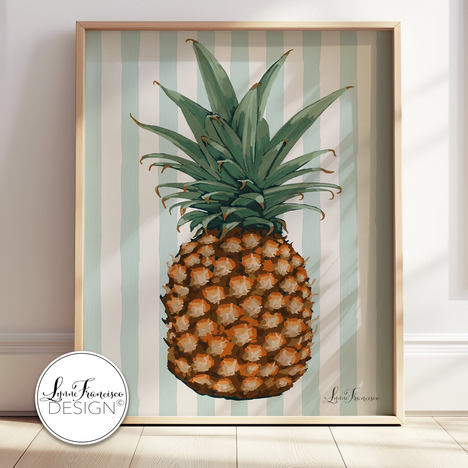 Pineapple on aqua & cream stripe background painted in Adobe Fresco on Ipad.
