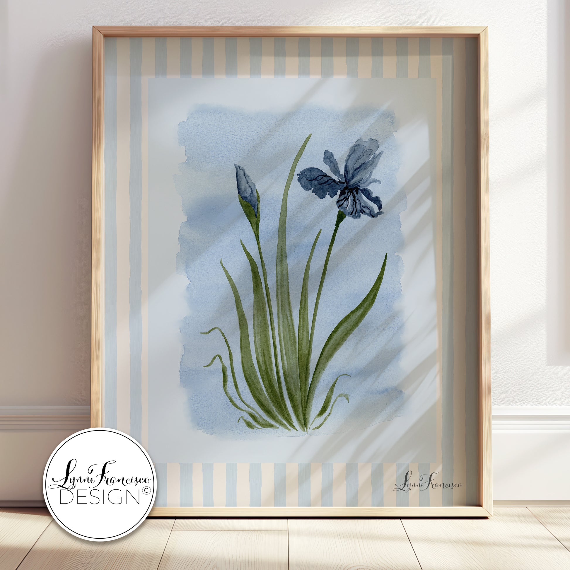 Blue iris floral, originally painted with watercolor on paper, on blue & cream background.