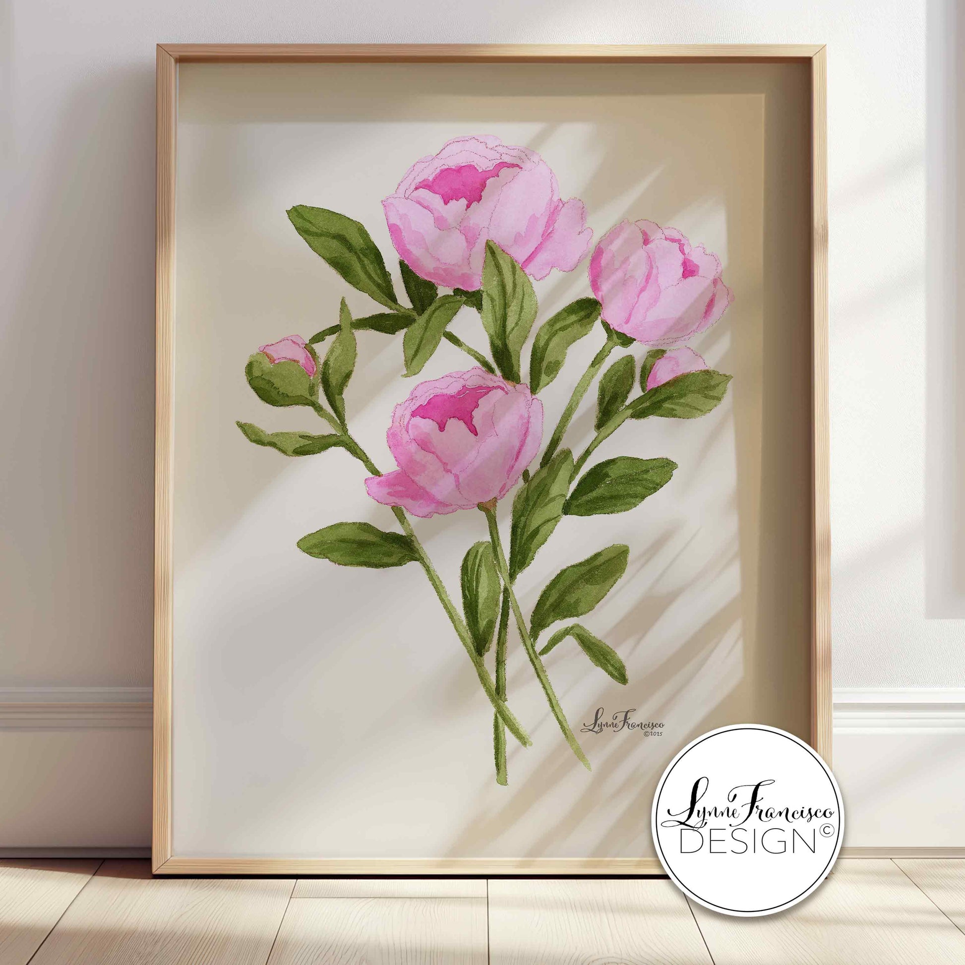 Hand-drawn with colored pencil & painted with watercolor, featuring a floral bouquet in pinks & greens, floating on a solid cream background.